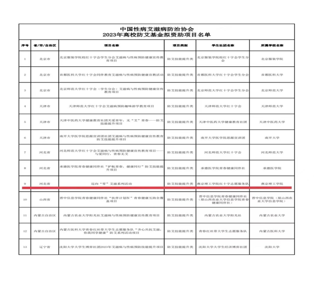 喜报—燕京理工学院红十字志愿服务队在“中国性病艾滋病防治协会2023年高校防艾滋基金拟资助项目名单中脱颖”