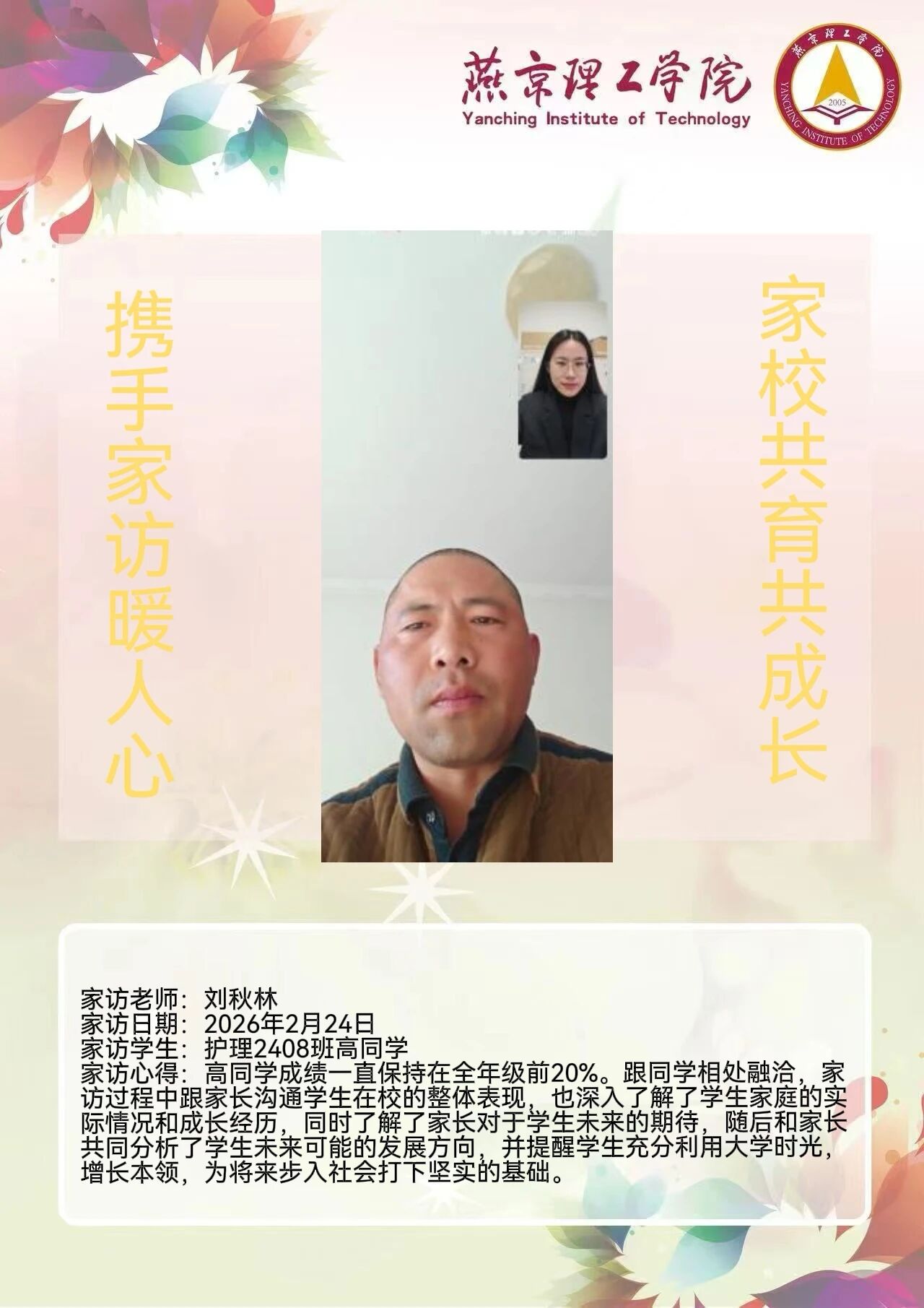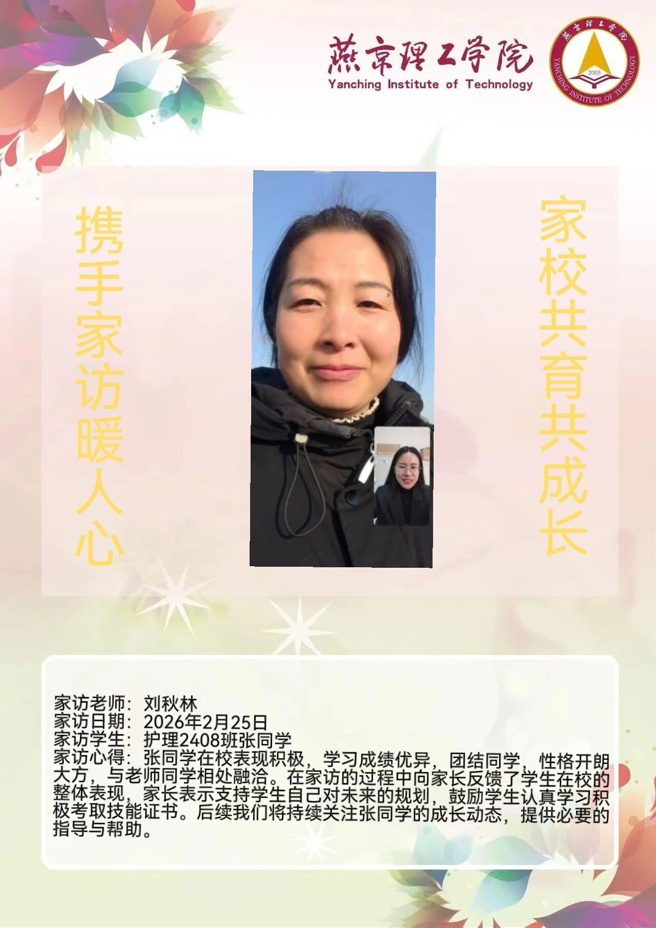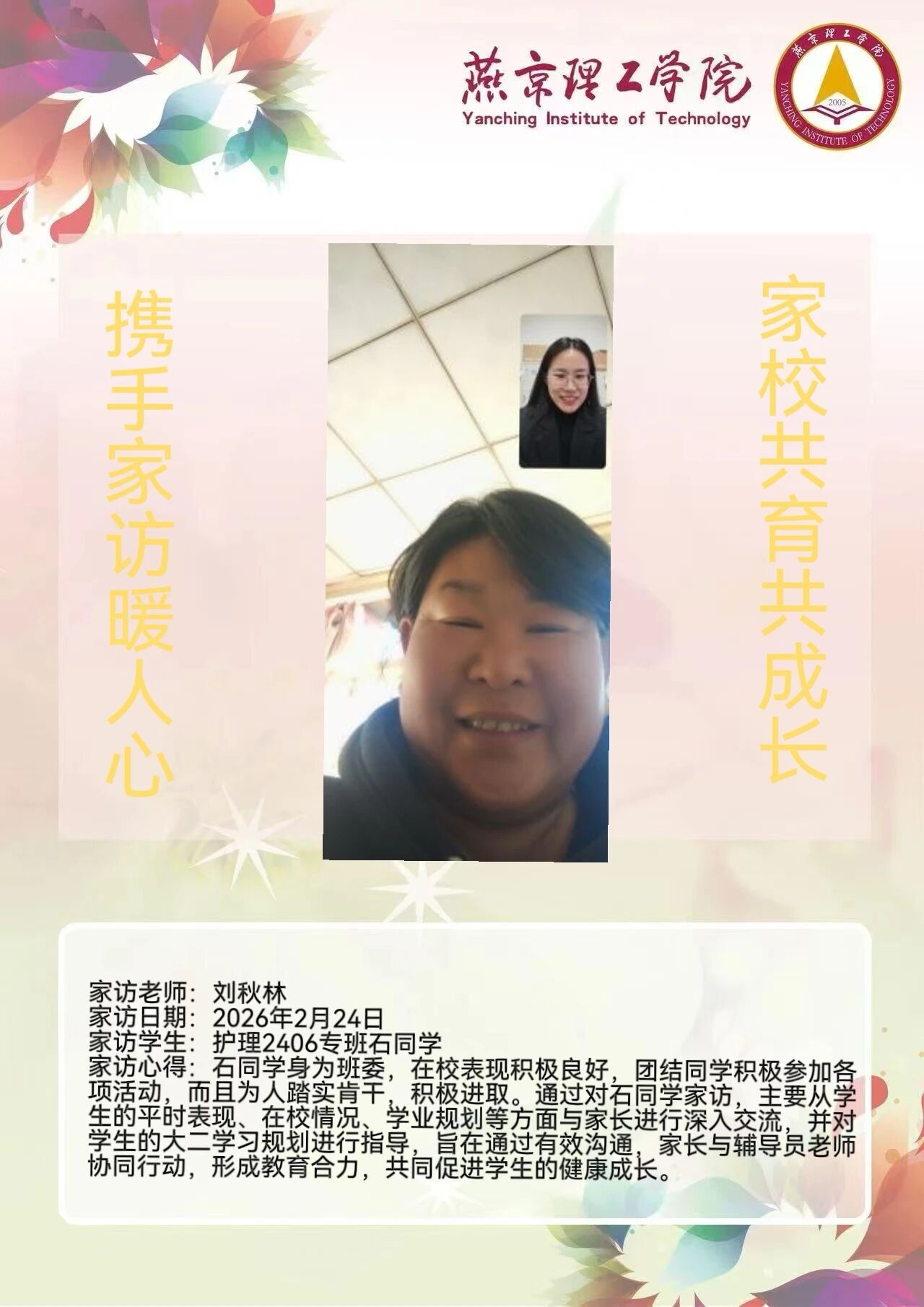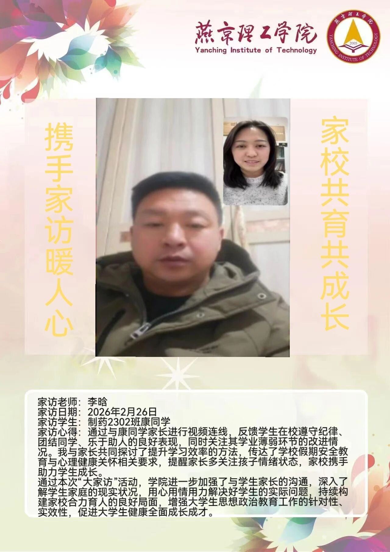 为全面落实立德树人根本任务,深化拓展家校协同育人路径,环境与健康学院于2026年寒假扎实开展了“携手伴成长,家访拓新篇”主题大家访活动。辅导员老师通过线上视频形式与学生家庭开展“面对面”深度对话,将学校的关怀与温暖精准送达学生家庭,筑牢家校协同育人桥梁。 刘秋林老师 侯兴帅老师 李晗老师