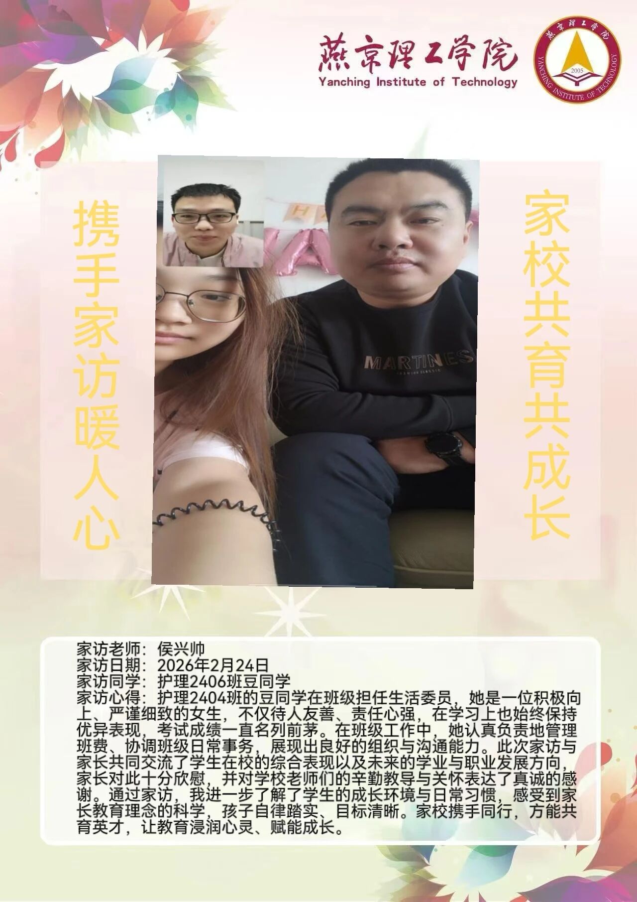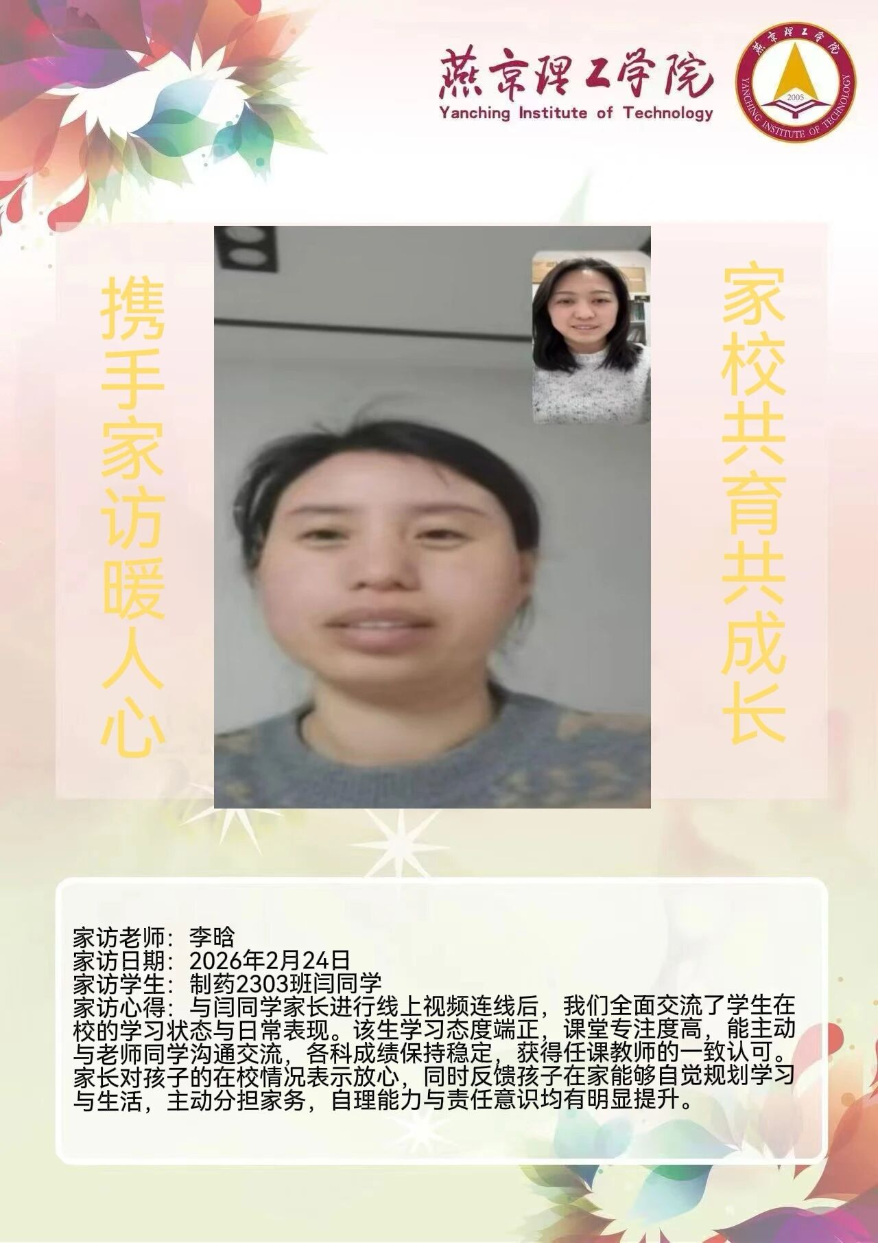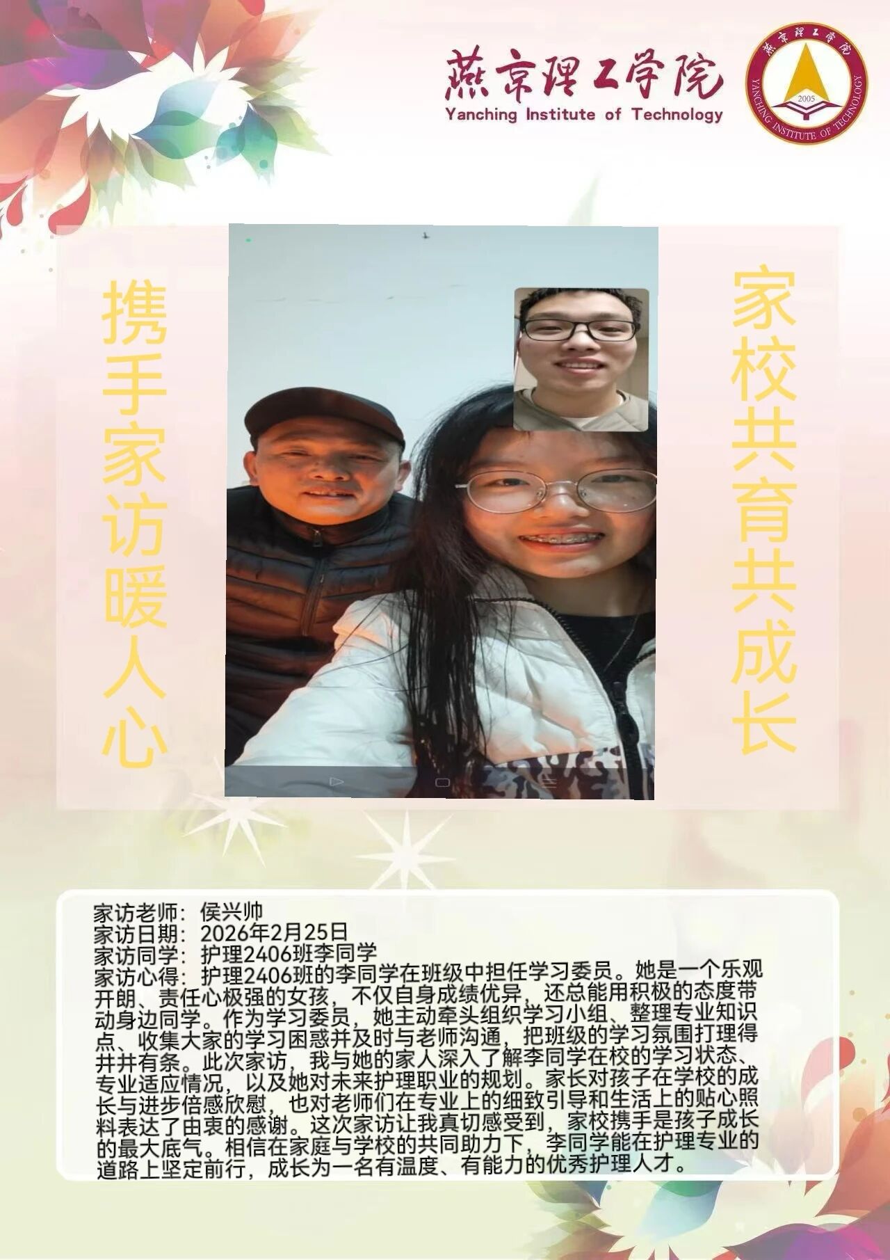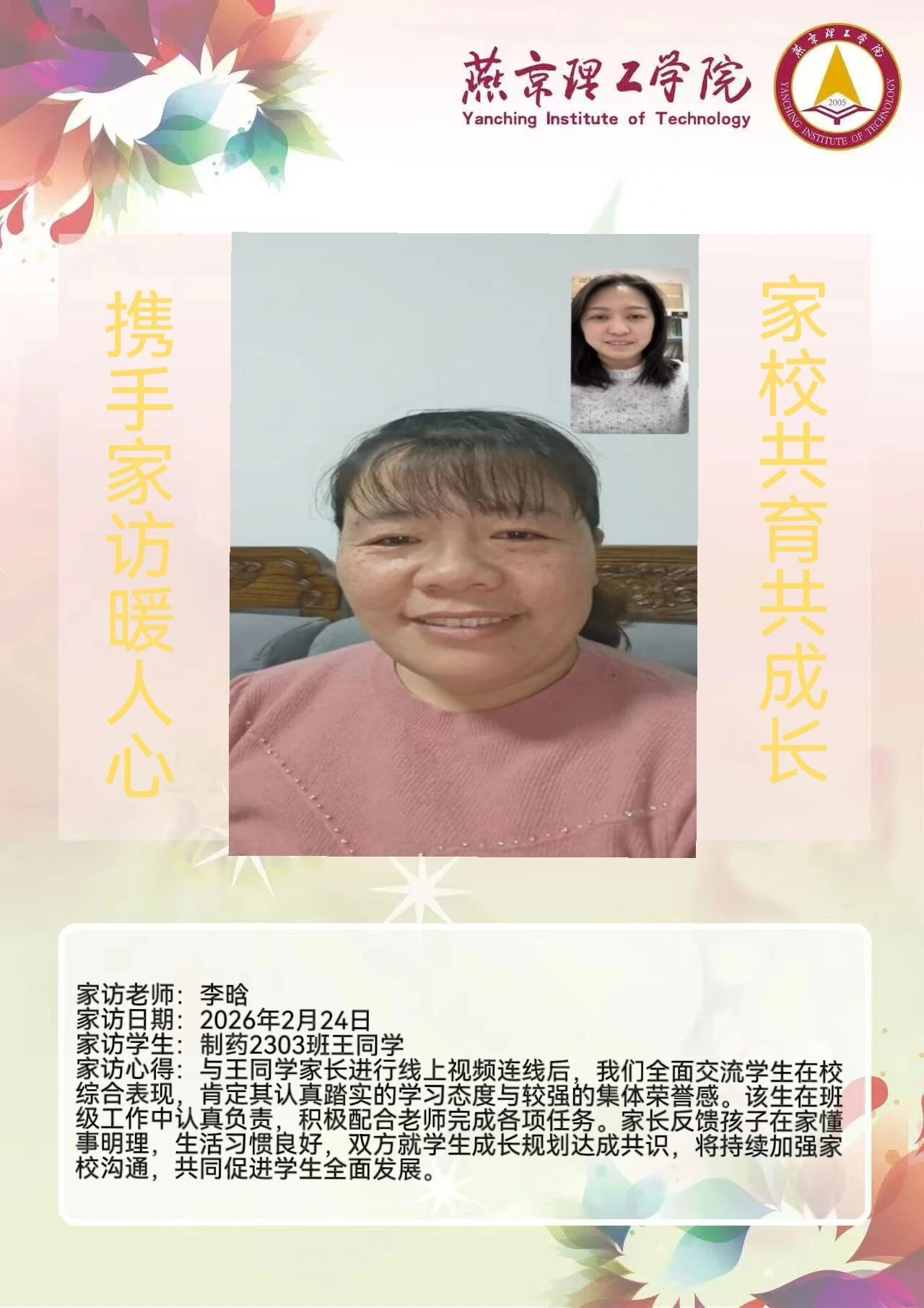为全面落实立德树人根本任务,深化拓展家校协同育人路径,环境与健康学院于2026年寒假扎实开展了“携手伴成长,家访拓新篇”主题大家访活动。辅导员老师通过线上视频形式与学生家庭开展“面对面”深度对话,将学校的关怀与温暖精准送达学生家庭,筑牢家校协同育人桥梁。 刘秋林老师 侯兴帅老师 李晗老师