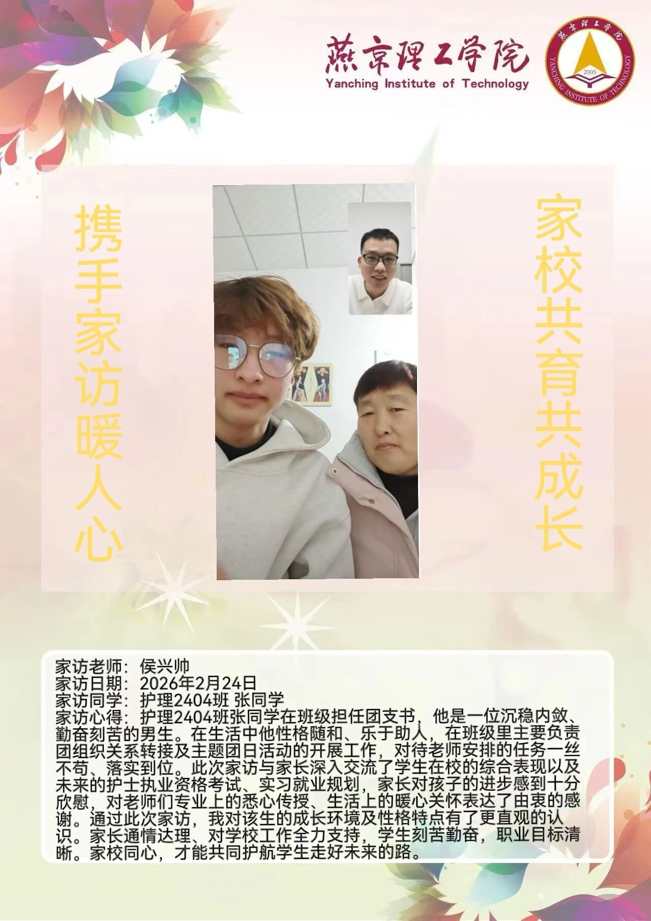 为全面落实立德树人根本任务,深化拓展家校协同育人路径,环境与健康学院于2026年寒假扎实开展了“携手伴成长,家访拓新篇”主题大家访活动。辅导员老师通过线上视频形式与学生家庭开展“面对面”深度对话,将学校的关怀与温暖精准送达学生家庭,筑牢家校协同育人桥梁。