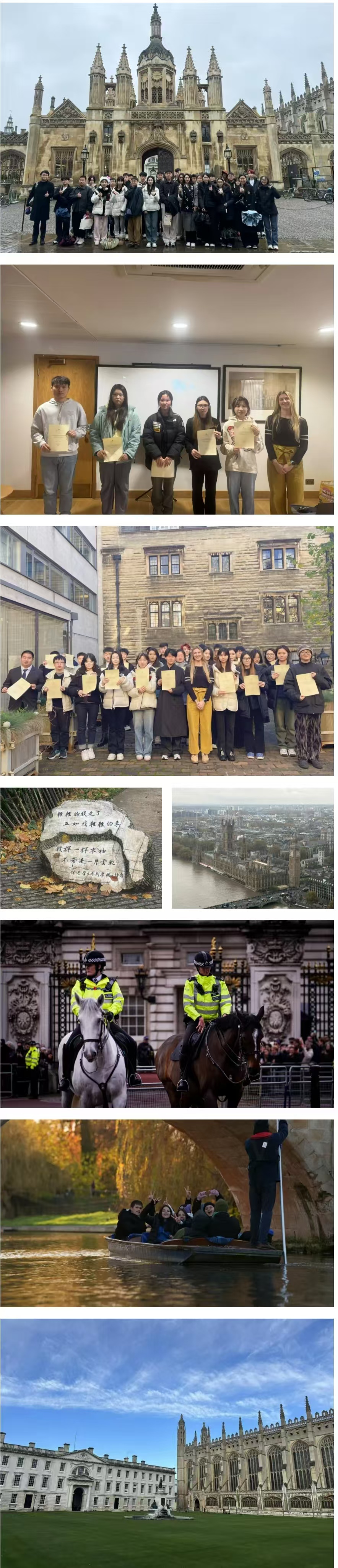 剑桥—青年领袖训练营为青年提供了短期的沉浸式研学平台,培养一批具有全球视野、跨文化交流能力和创新精神的高素质青年学子。学员们走进剑桥大学的课堂,与教授们进行面对面交流探讨,感受名校深厚的文化底蕴和前沿的学术成果。通过丰富的研学活动,深入了解英国的历史文化和社会风貌,拓宽全球视野。剑桥—青年领袖训练营项目的学员们走向世界、认识世界,进行一次学术与文化的深度探索之旅,更是一次自我挑战与成长的宝贵经历。
