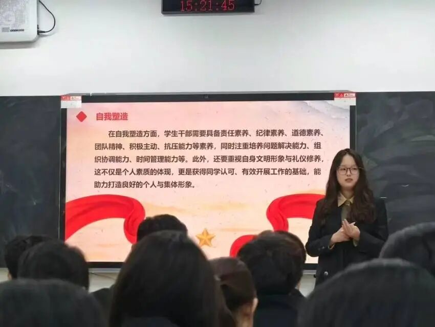 为助力25级班长们明确职责定位、提升综合素养,更好地发挥桥梁纽带作用,环境与健康学院于2025年11月5日在K2-101组织召开了"琢玉工程"学生班长培训第三讲。环境与健康学院张嫚老师以“学思践悟新思想,知行合一担使命”为核心主题开展专题演讲,25级各班班长参加此次培训。 会议伊始,张嫚老师从班长的角色认知与成长切入,明确班长这一角色作为连接同学和学校的重要纽带,肩负引领者、调解者、建设者和整合者的多重职责。她强调,班长需深化职责认知,在自我塑造上要具备责任、纪律等综合素养,培养问题解决、组织协调等核心能力,以良好形象获得同学认可。 随后张嫚老师指出,班长的工作核心是构建高效沟通网络,要精准对接老师、落实工作要求,坚守政治底线、传播正能量。同时,需秉持全面发展理念,勇于应急担当,加强班级联动与师生互动。她强调,在校练就的时间管理、沟通能力及认真负责态度,都是职场必备素养;鼓励多与师生交流,积累的人脉将成为未来社会助力。 会议最后,张嫚老师为在场班长送上寄语。她表示:“班长的岗位是成长的‘练兵场’,每一次服务同学、每一次协调事务,都是在为未来的担当积累力量。希望大家始终牢记‘服务同学、奉献校园’的初心,以‘学思践悟’锤炼品格,以‘知行合一’践行使命,在解决问题中成长,在担当责任中成熟,让青春在为集体、为社会的奉献中绽放光彩。” 通过此次活动,班长们不仅对自身角色与职责有了更深刻的认知,更在能力提升与成长规划上获得了切实指导。大家纷纷表示,将把此次分享的知识与方法运用到实际工作中,以更坚定的责任担当、更多高效的工作能力、更饱满的热情投入到服务同学与校园建设中,真正做到学思践悟新思想,知行合一担使命,努力成长为有理想、敢担当、能奉献的优秀学生干部。