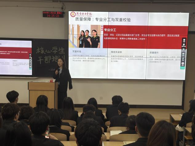 为助力燕京理工学院学子深入认知环境与健康学院组织架构与诉求反馈机制,切实增强学生对学院的归属感与参与感,环境与健康学院于11月26日在E101开展两场专项培训会,由富萌老师担任主讲,参会人员有各学生组织核心干部。 第一讲,富萌老师聚焦于环境与健康学院各主要部门的系统介绍。团总支,学生会,新闻中心,只争朝夕四个部门,在学院的发展进程中均具有独特且不可替代的价值。她强调,各部门要精准锚定自身职能边界,清晰界定差异化工作重心,既要杜绝超出职责范围的越位行为,也要规避履职不到位的缺位问题,唯有坚守岗位、协同发力,才能凝聚成学院高效运转的强大合力,全方位护航各项工作稳步向前。 第二讲,富萌老师深入解读了学院学生诉求反应闭环流程。她指出,该流程构建了一套科学、完善的诉求处理体系,涵盖诉求收集、反馈、解决和闭环等关键环节,切实保障学生诉求得以妥善解决。通过互动交流让大家更清晰掌握流程实操要点,切实保障学生诉求得以妥善解决。富萌老师通过条理清晰的流程拆解与贴合工作实际的互动交流,使同学们深刻领会了该流程的核心要义与实际应用。 通过此次培训,环境与健康学院各学生组织核心干部不仅了解了学院部门架构与职能分工,更熟练掌握了学生诉求反馈闭环的运行逻辑与实操方法。大家纷纷表示,将把培训所学转化为服务同学的实际行动,以更清晰的定位、更高效的协作、更务实的作风履职尽责,搭建起学院与学生间的坚实沟通桥梁,切实提升同学们的归属感与满意度,为学院高质量发展注入青春动能。