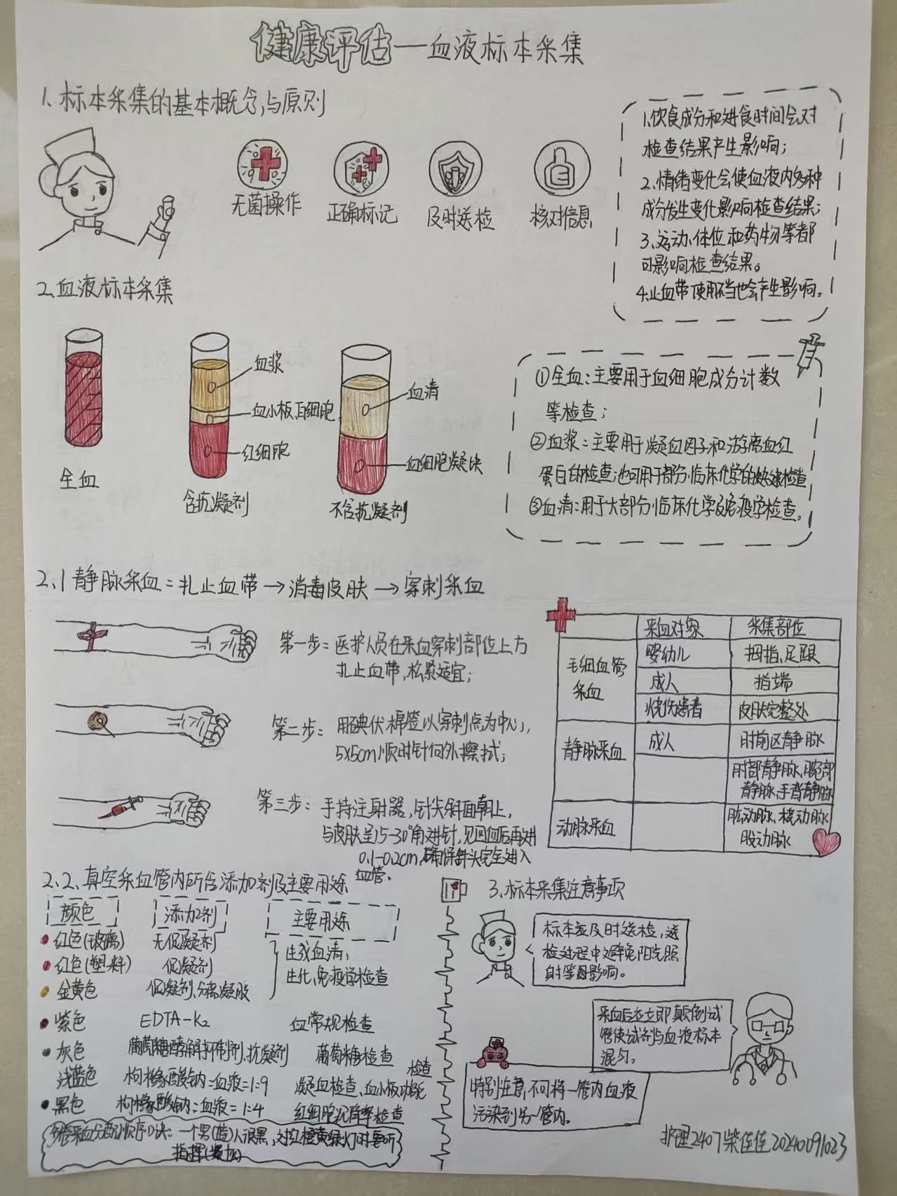 如何将庞杂的《健康评估》知识体系,内化为清晰的临床思维路径?近日,在我院护理学专业《健康评估》课程的期末展示中,学生们交出了一份份令人惊喜的“答卷”。他们不再是知识的被动接收者,而是化身设计者与整合者,将问诊、体格检查、症状鉴别、资料分析等核心内容,转化为一幅幅逻辑严密又独具创意的手绘作品,展现了扎实的专业功底与初具雏形的临床判断力。 此次学生课程总结作品,并非简单的知识罗列,而是体现了同学们对课程内容的深度消化与个性化重构。作品形式多样,既有逻辑清晰的思维导图,将评估流程、重点体征、鉴别要点等串联成网;也有精心设计的表格对比,清晰呈现不同系统疾病评估的异同;还有同学以案例分析为线索,将理论知识点融入具体情境,展现了初步的临床推理过程。部分作品还巧妙运用图表、简笔画等形式,使抽象概念和复杂步骤变得直观易懂,体现了护理学生的人文关怀与沟通表达潜力。 护理2401班 护理2402班 护理2403班 护理2404班 护理2405班 护理2406班 护理2407班 护理2408班 课程主讲教师王美皓评价道:“这些凝聚了学生智慧与心血的作品,我能清晰地看到学生们在尝试‘像护士一样思考’。他们不仅记住了‘是什么’,更在探索‘为什么’和‘怎么做’。尤其是能考虑到评估过程中的心理社会因素和患者个体差异,这标志着他们正从理论学习向专业的临床护理思维迈进。” 一场作业展示,成为了检阅学习成果、激发创新思维、促进教学相长的生动课堂。这些作品犹如一面镜子,映照出护理学子严谨求实的专业态度与萌芽中的临床智慧,也预示着他们未来在守护健康道路上,将走得更加沉稳、更具洞察力。
