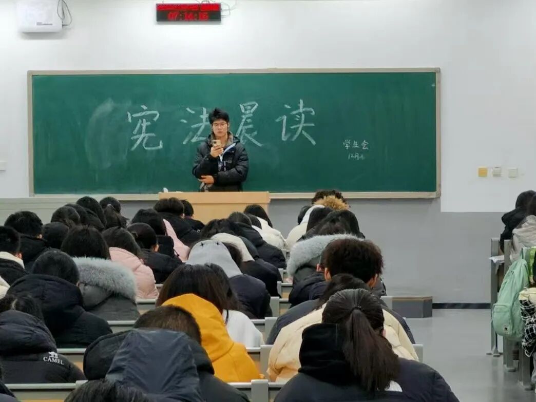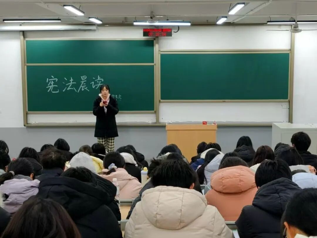 为深入学习宣传宪法知识,引导青年学生感悟宪法的崇高与尊严,自觉增强宪法意识、维护宪法权威、践行守法准则,环境与健康学院学生会自2025年12月起,组织各班级依托早自习时段有序开展宪法晨读系列活动。 宪法晨读活动启动前,学院学生会提前制定详实方案,明确活动具体要求与实施流程;各班级班长积极响应号召,精心筹备宪法文本等学习资料,为活动的顺利开展筑牢坚实基础。 晨读现场,各班级以集体诵读为主要形式,在班长的带领下,同学们逐章逐句研读宪法条文,诵读声整齐洪亮、铿锵有力。在二十分钟左右的沉浸式学习中,大家深刻感悟宪法的严谨内涵与精神实质,全方位展现出青年学子尊法学法的良好风貌。 活动尾声,学院对本次宪法晨读系列活动的开展成效给予充分肯定,同时勉励全体同学以此次晨读为契机,将宪法学习融入日常学习生活,做到学思用贯通、知信行统一,在一言一行中自觉践行宪法精神。 活动尾声,学院对本次宪法晨读系列活动的开展成效给予充分肯定,同时勉励全体同学以此次晨读为契机,将宪法学习融入日常学习生活,做到学思用贯通、知信行统一,在一言一行中自觉践行宪法精神。