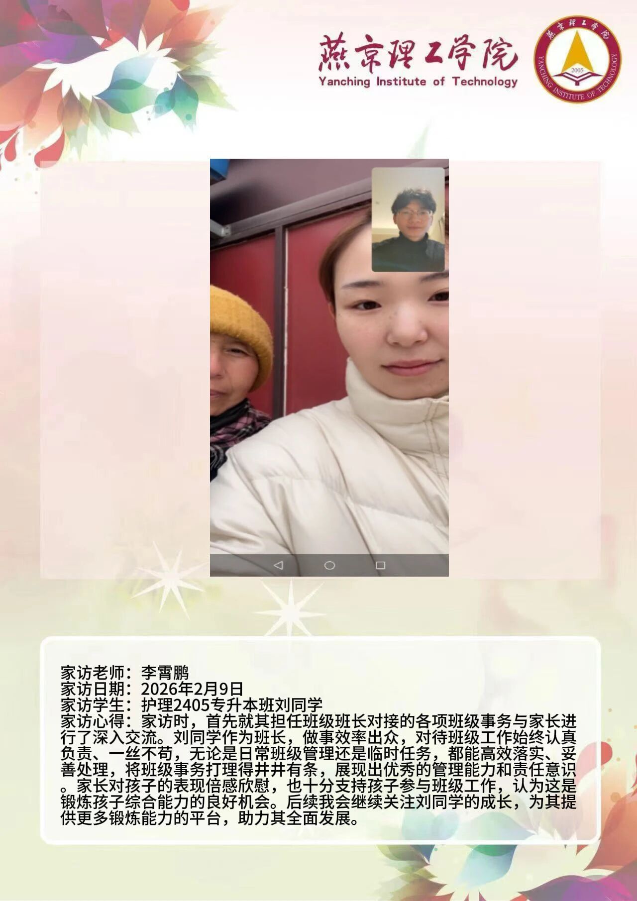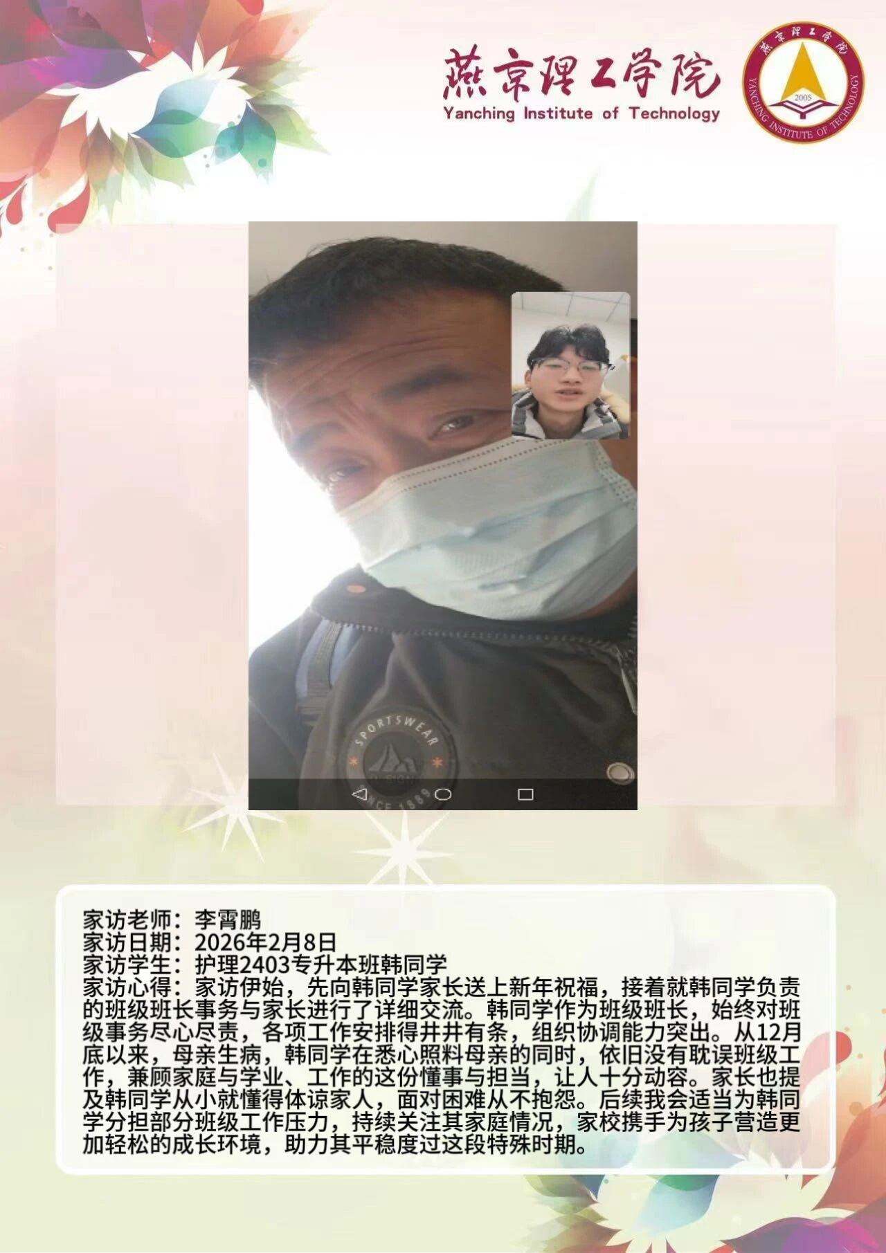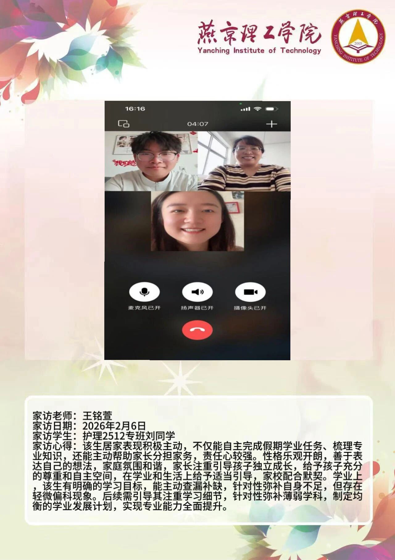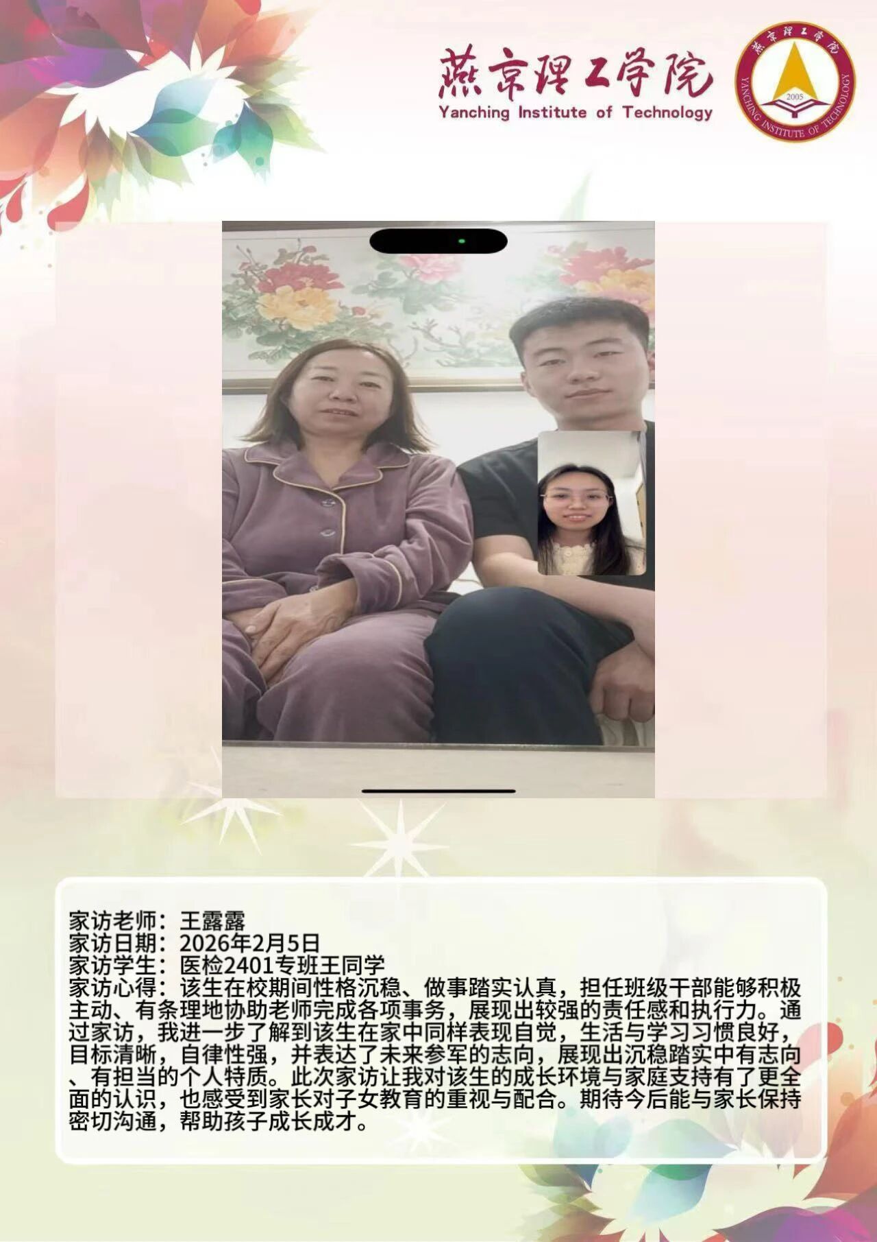 为全面落实立德树人根本任务,深化拓展家校协同育人路径,环境与健康学院于2026年寒假扎实开展了“携手伴成长,家访拓新篇”主题大家访活动。辅导员老师通过线上视频形式与学生家庭开展“面对面”深度对话,将学校的关怀与温暖精准送达学生家庭,筑牢家校协同育人桥梁。 王铭萱老师 王露露老师 李霄鹏老师 通过本次“大家访”活动,学院进一步加强了与学生家长的沟通,深入了解学生家庭的现实状况,用心用情用力解决好学生的实际问题,持续构建家校合力育人的良好局面,增强大学生思想政治教育工作的针对性、实效性,促进大学生健康全面成长成才。