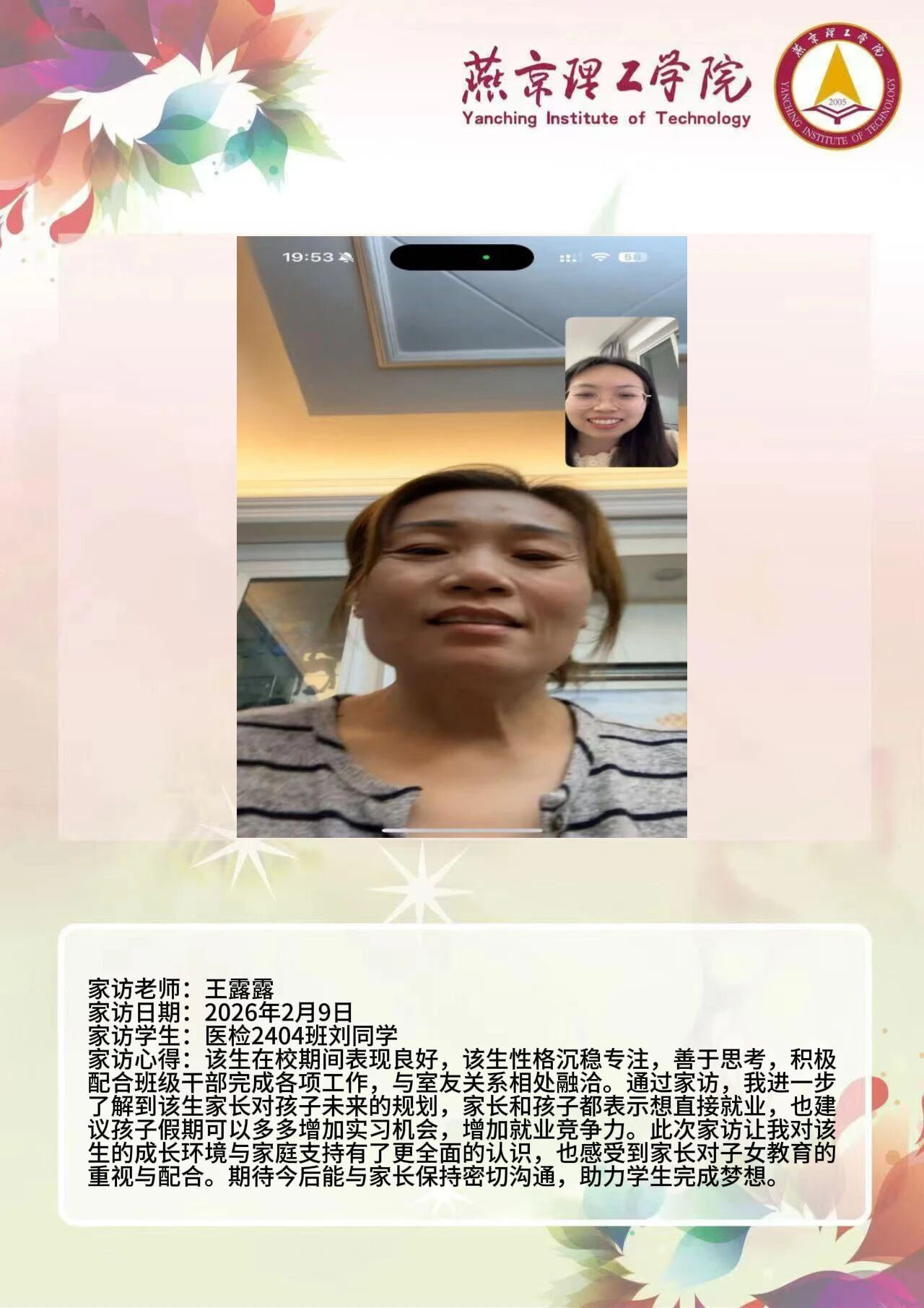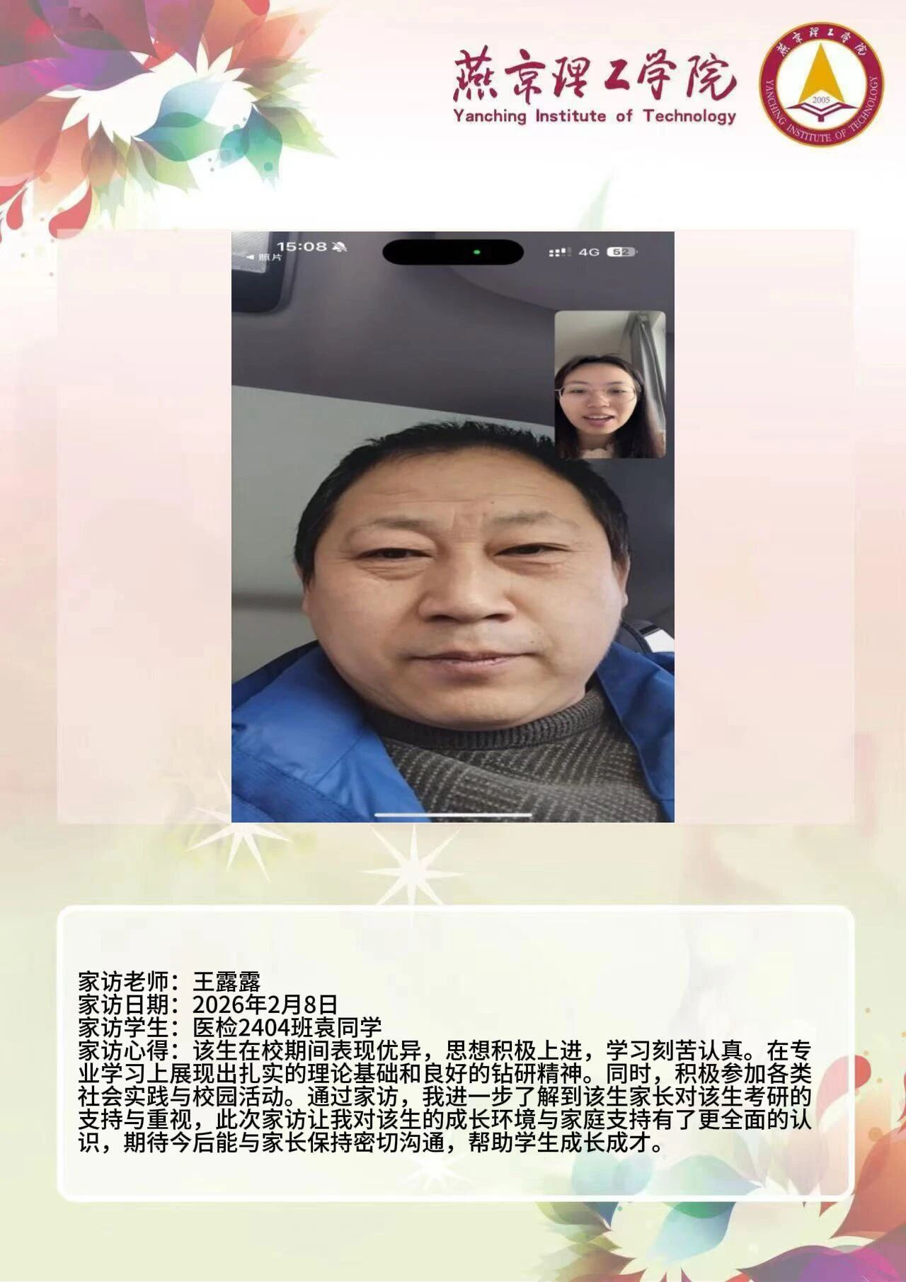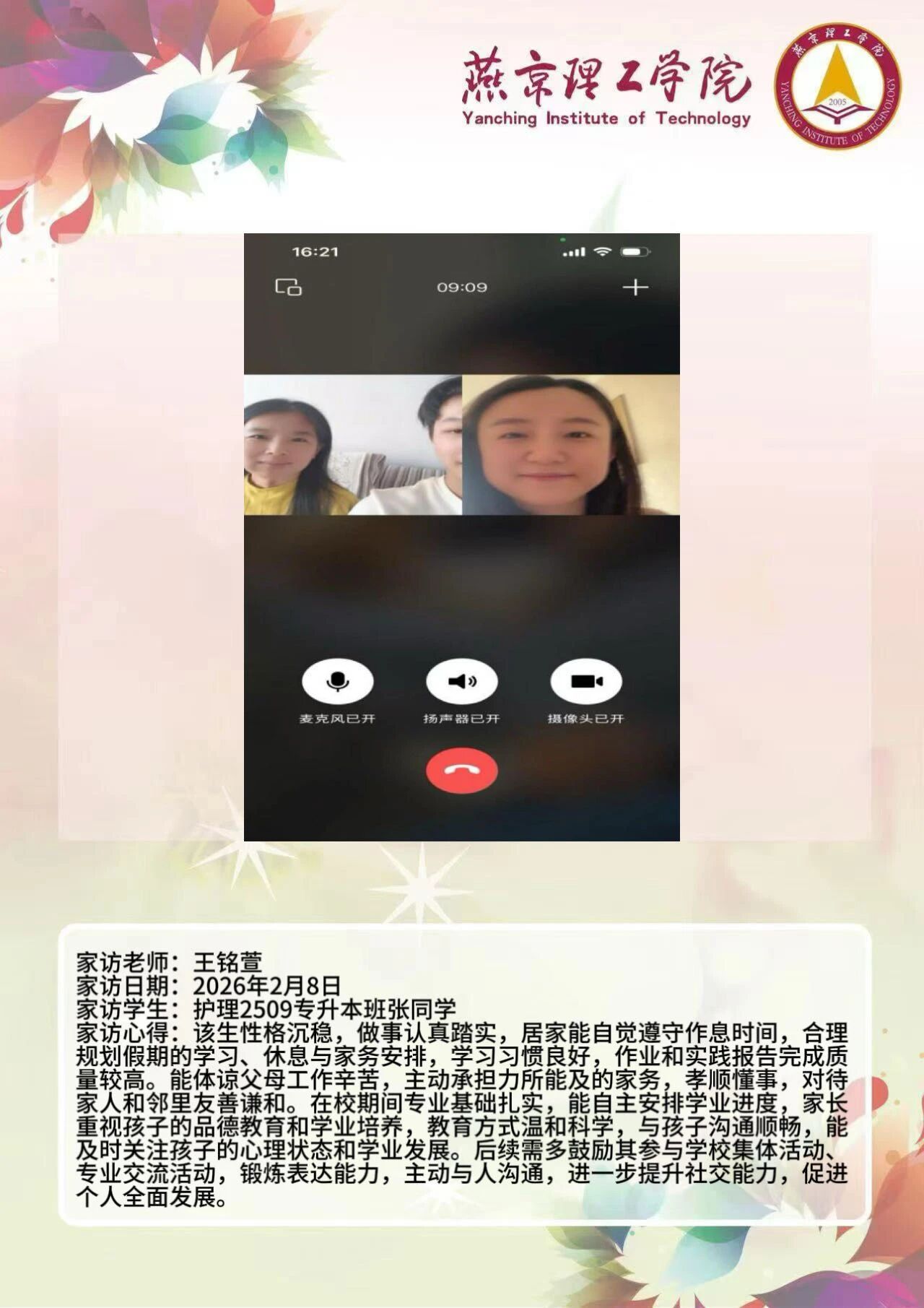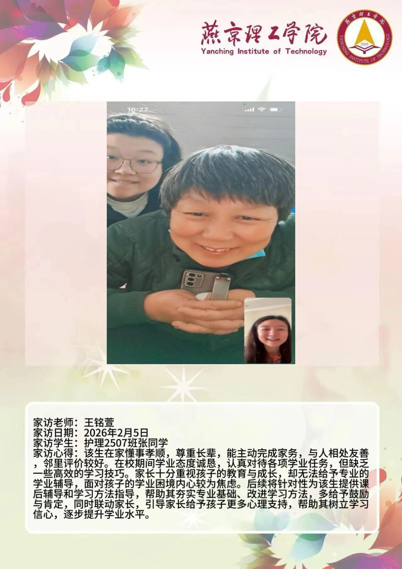为全面落实立德树人根本任务,深化拓展家校协同育人路径,环境与健康学院于2026年寒假扎实开展了“携手伴成长,家访拓新篇”主题大家访活动。辅导员老师通过线上视频形式与学生家庭开展“面对面”深度对话,将学校的关怀与温暖精准送达学生家庭,筑牢家校协同育人桥梁。 王铭萱老师 王露露老师 李霄鹏老师 通过本次“大家访”活动,学院进一步加强了与学生家长的沟通,深入了解学生家庭的现实状况,用心用情用力解决好学生的实际问题,持续构建家校合力育人的良好局面,增强大学生思想政治教育工作的针对性、实效性,促进大学生健康全面成长成才。