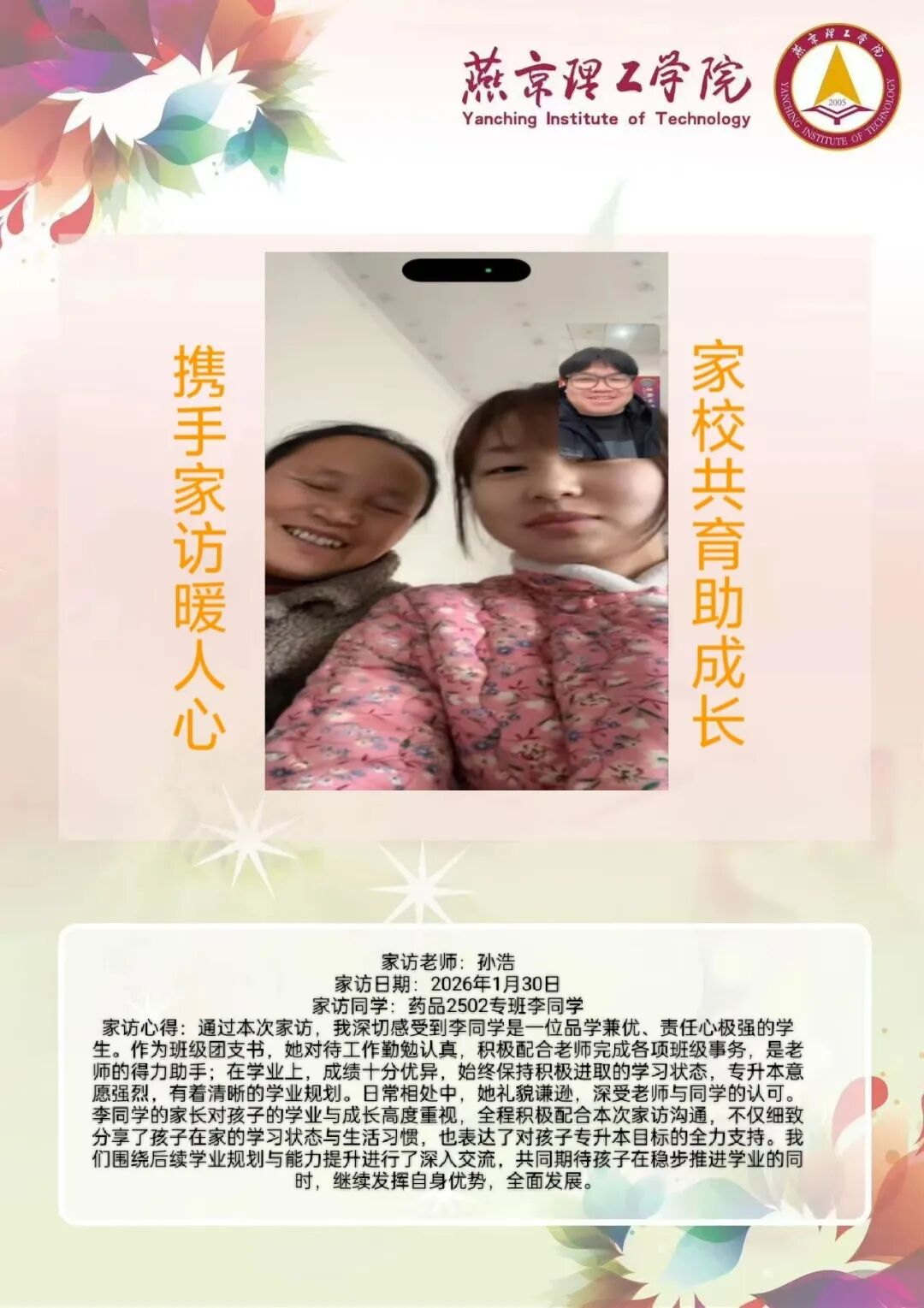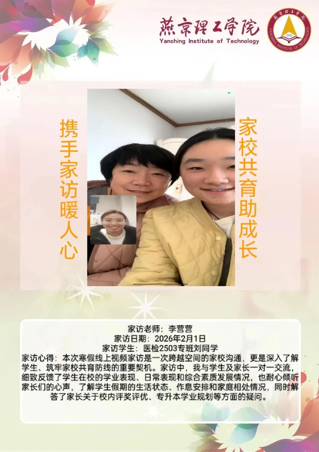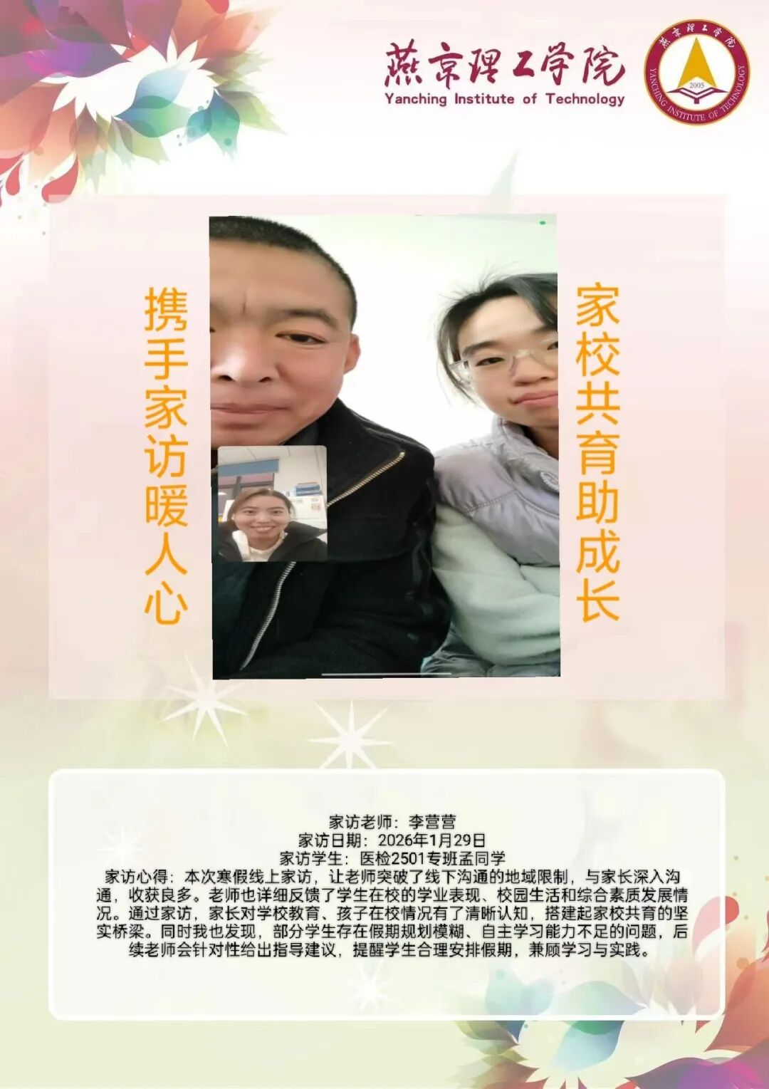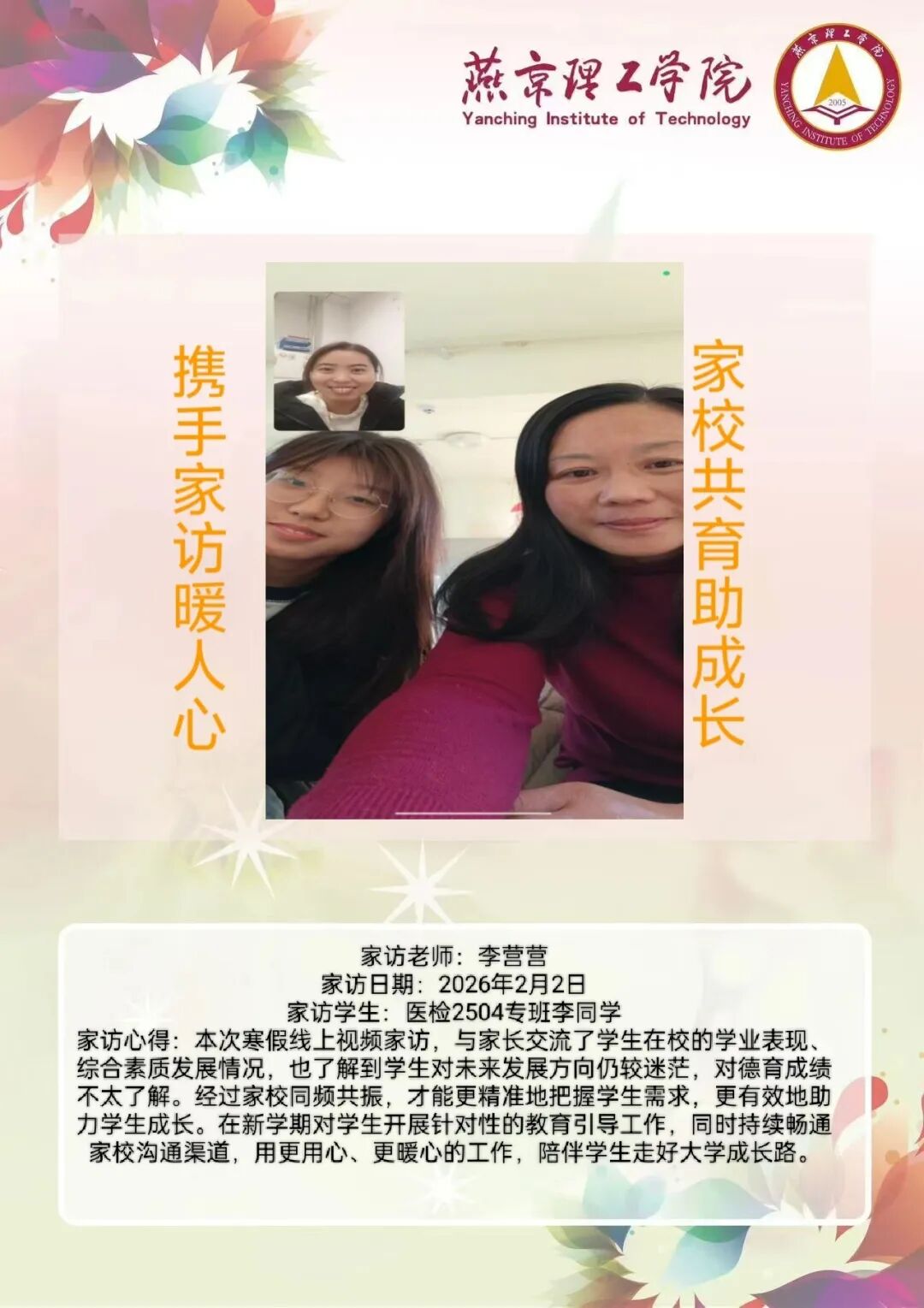 为全面落实立德树人根本任务,深化拓展家校协同育人路径,环境与健康学院于2026年寒假扎实开展了“携手伴成长,家访拓新篇”主题大家访活动。辅导员老师通过线上视频形式与学生家庭开展“面对面”深度对话,将学校的关怀与温暖精准送达学生家庭,筑牢家校协同育人桥梁。 李营营老师 孙浩老师 刘海玲老师 通过本次“大家访”活动,学院进一步加强了与学生家长的沟通,深入了解学生家庭的现实状况,用心用情用力解决好学生的实际问题,持续构建家校合力育人的良好局面,增强大学生思想政治教育工作的针对性、实效性,促进大学生健康全面成长成才。