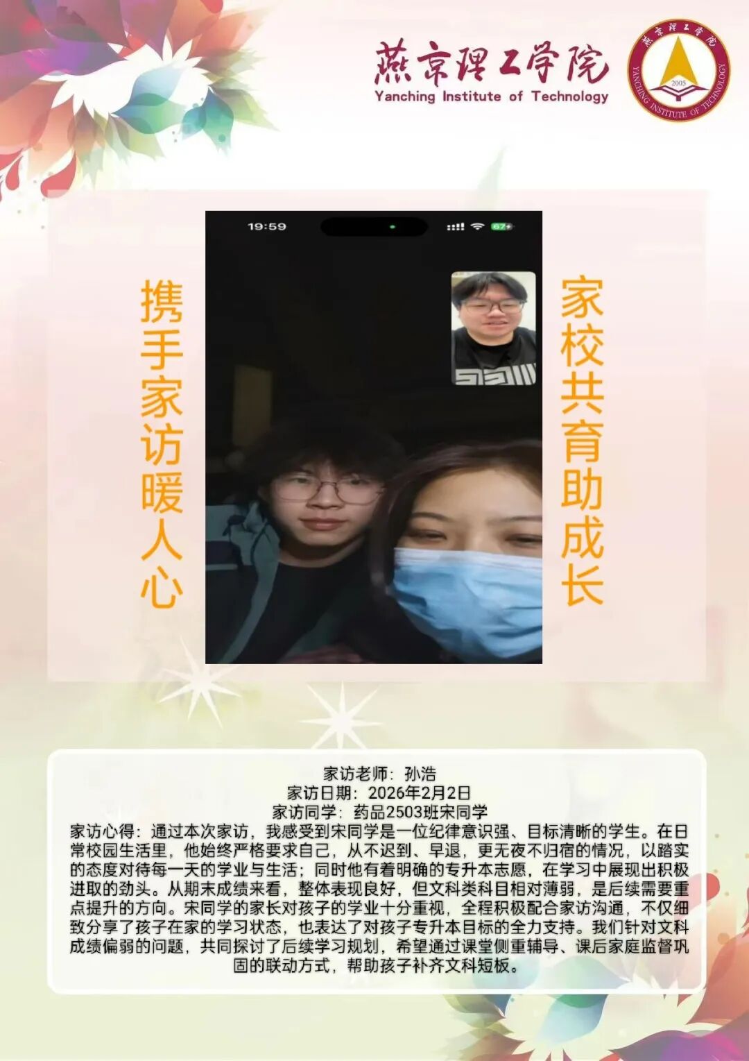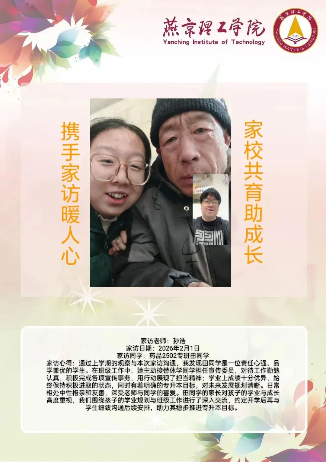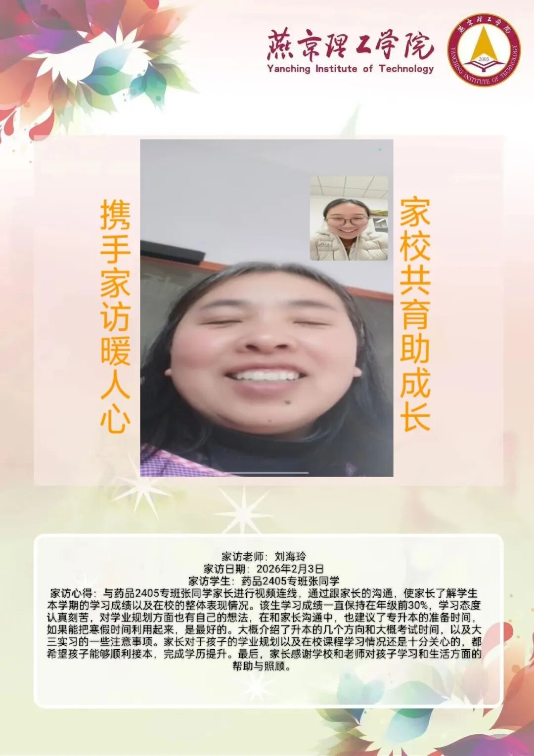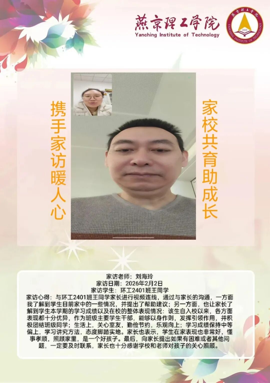 为全面落实立德树人根本任务,深化拓展家校协同育人路径,环境与健康学院于2026年寒假扎实开展了“携手伴成长,家访拓新篇”主题大家访活动。辅导员老师通过线上视频形式与学生家庭开展“面对面”深度对话,将学校的关怀与温暖精准送达学生家庭,筑牢家校协同育人桥梁。 李营营老师 孙浩老师 刘海玲老师 通过本次“大家访”活动,学院进一步加强了与学生家长的沟通,深入了解学生家庭的现实状况,用心用情用力解决好学生的实际问题,持续构建家校合力育人的良好局面,增强大学生思想政治教育工作的针对性、实效性,促进大学生健康全面成长成才。